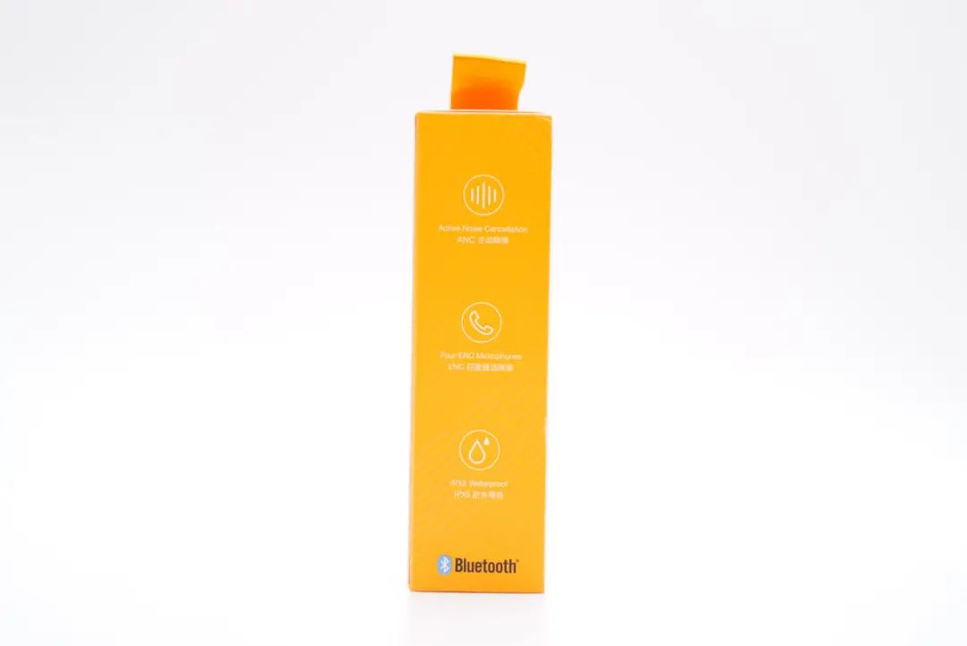 包装盒一侧图文展示了ANC主动降噪、ENC四麦通话降噪、IPX5防水等级三项亮点和蓝牙标志。