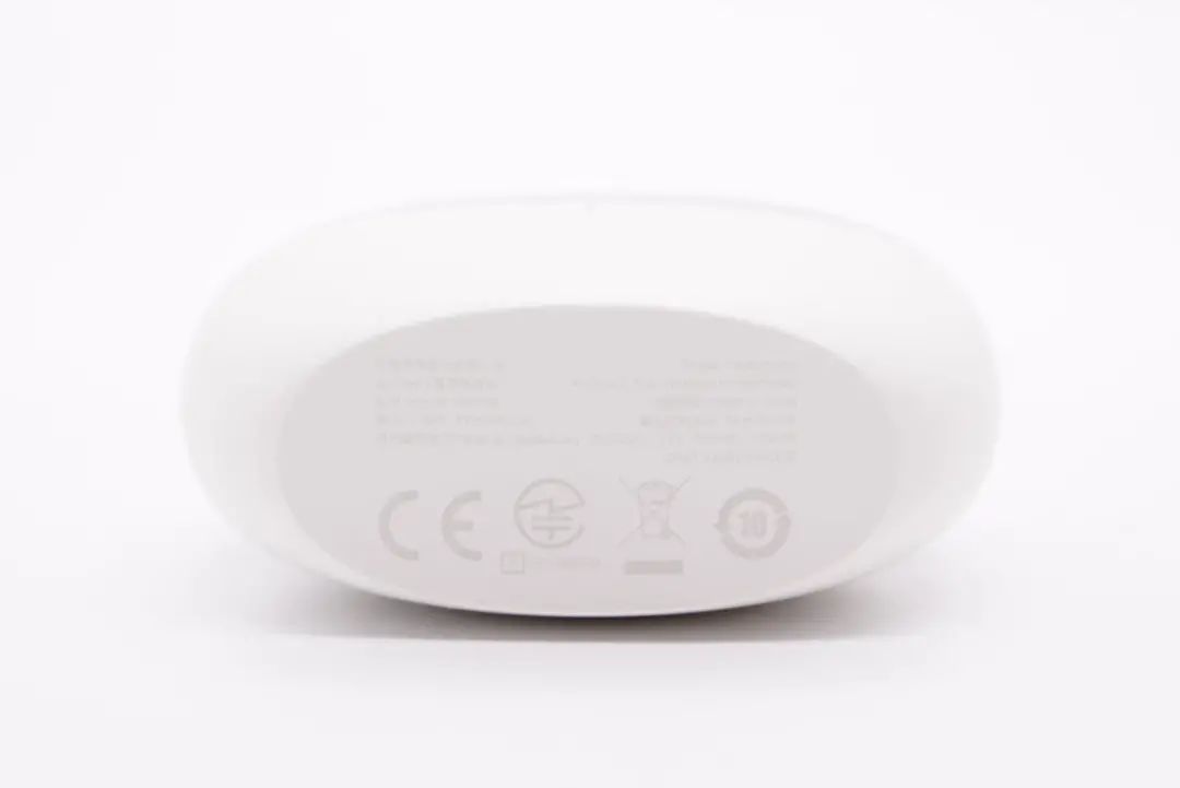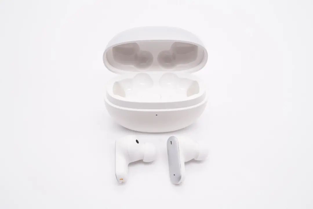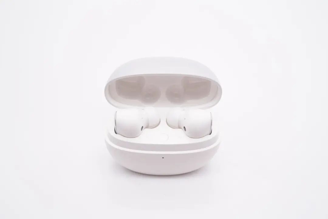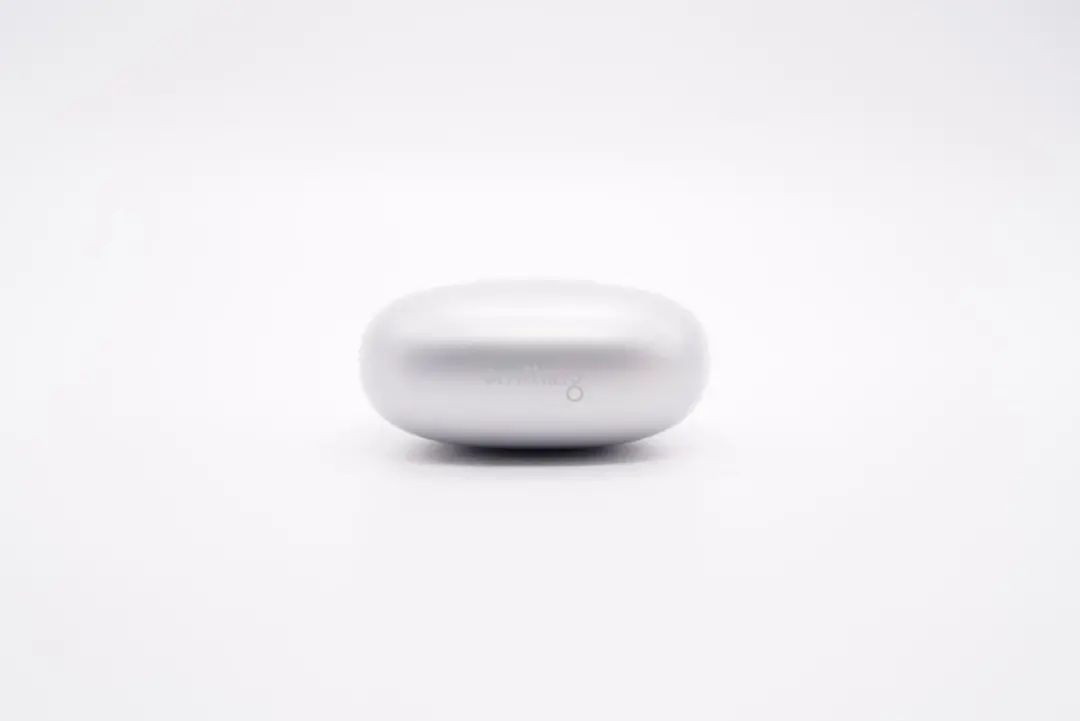 omthing AirFree2 真无线降噪耳机充电盒整体外观一览,充电盒盖和耳机座舱分别采用了两种工艺处理。正面设置有一颗指示灯,用于反馈充电盒剩余电量状态。
