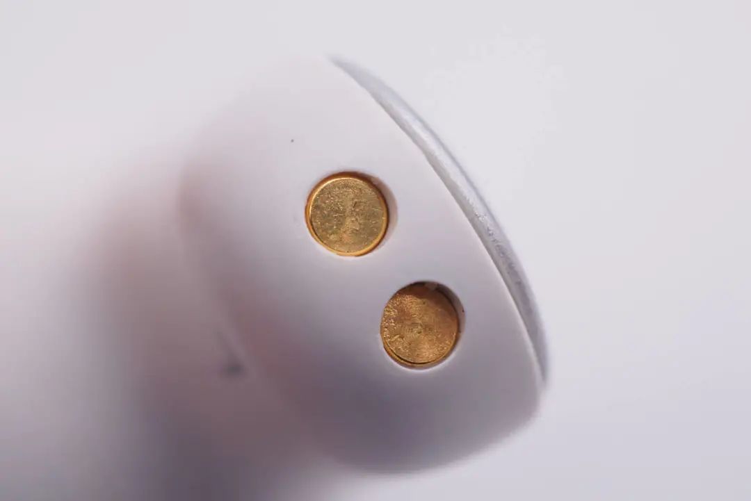 耳机上金属充电触点特写。