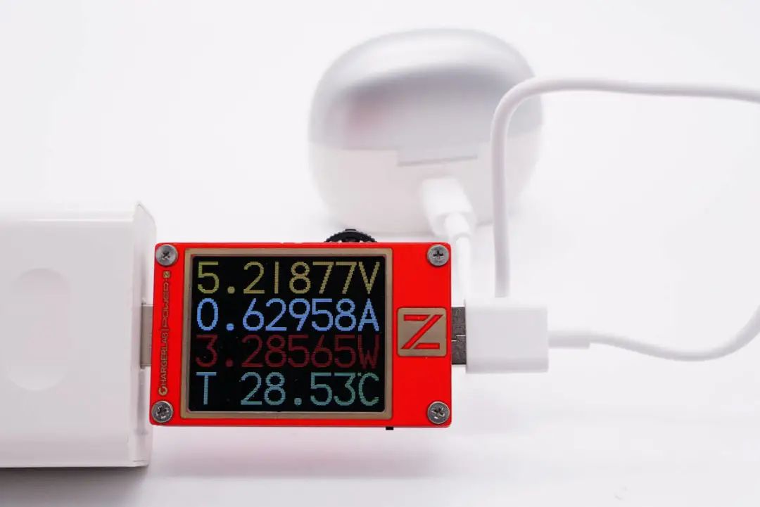 我爱音频网采用ChargerLAB POWER-Z KT002便携式电源测试仪omthing AirFree2 真无线耳机进行有线充电测试,输入功率约为3.29W