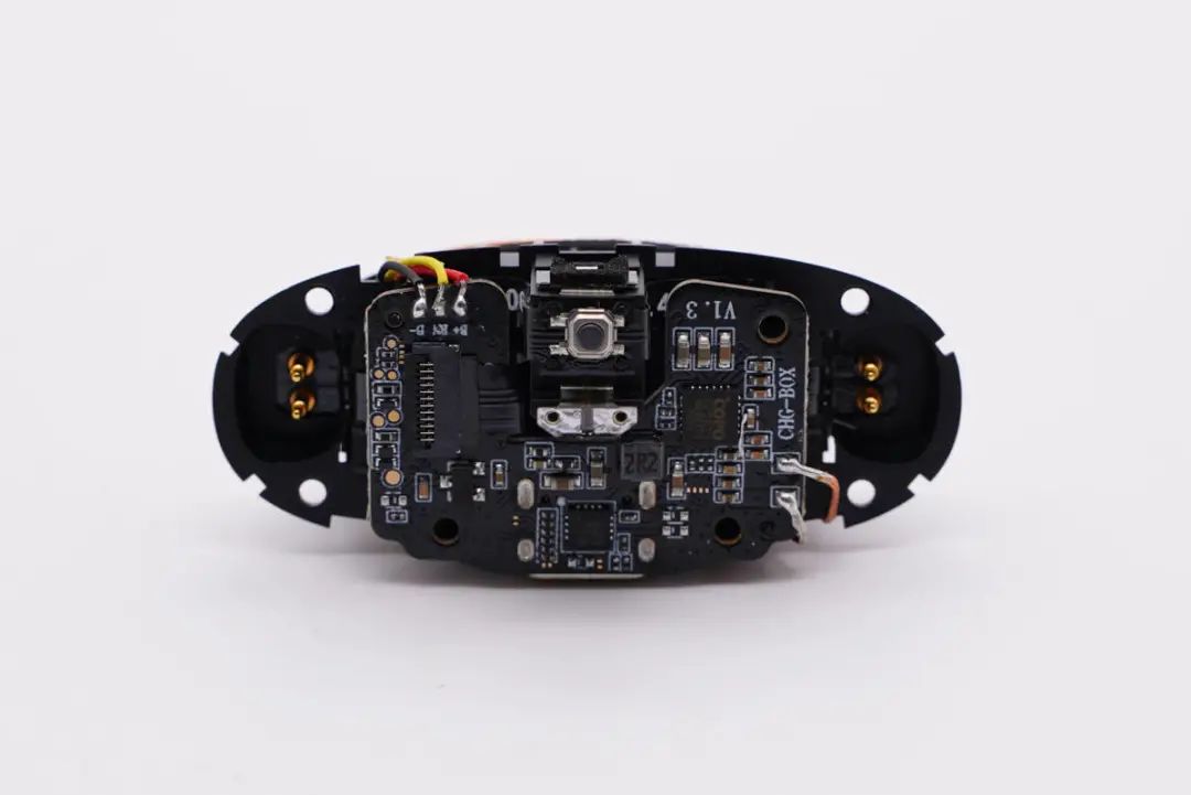 腔体壁上主控芯片位置贴有屏蔽贴纸,底部充电触点直接焊接在主板上。