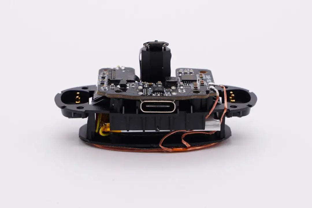 底部是无线充电接收线圈,电池位于中间位置,起到很好的保护作用。