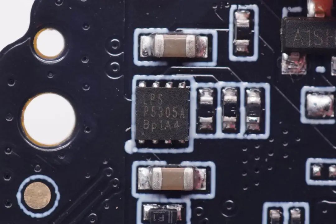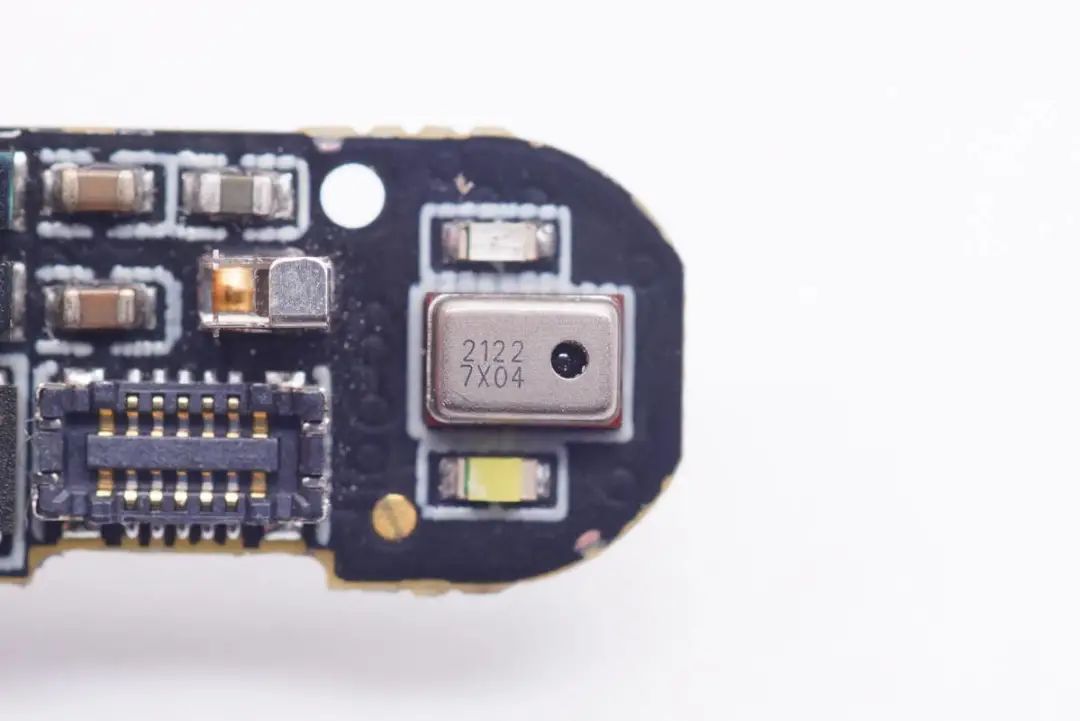 主板上采用欧付宝欧付电子2718上进音降噪麦克风,型号是SA2718T421-NB01,用于语音通话拾音。麦克风上下设置两颗LED指示灯,指示耳机工作状态。