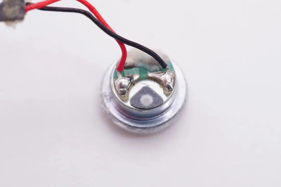 扬声器单元正面特写,胶水固定到耳机腔体内,金属外壳保护。