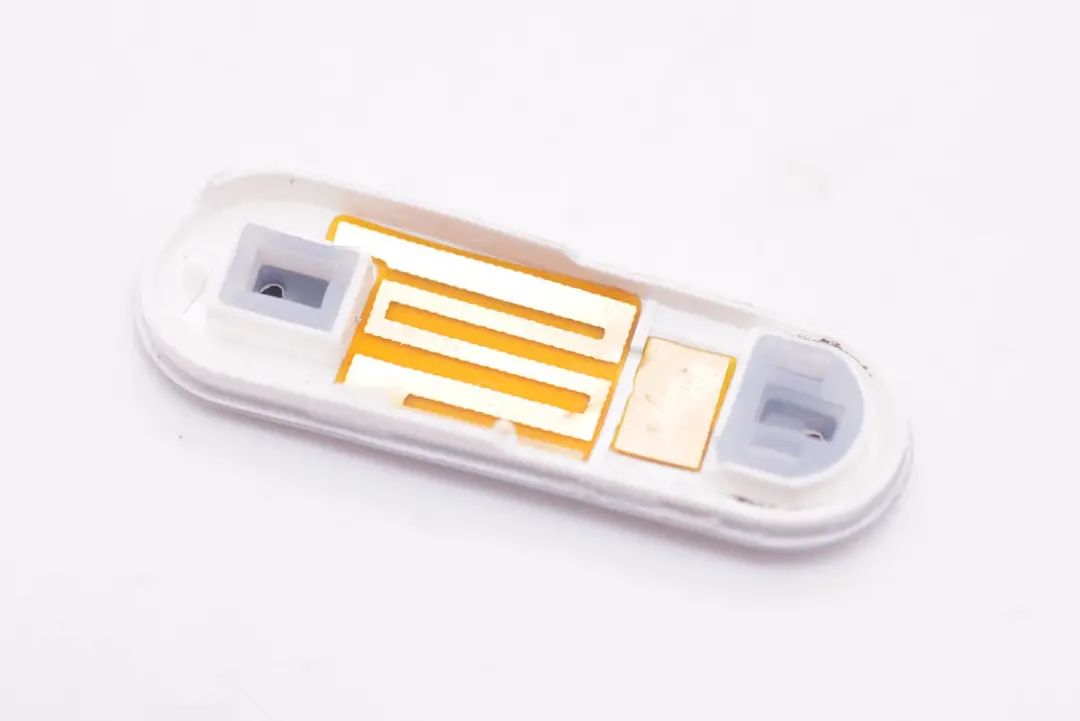 耳机柄盖板内侧结构一览,两端是麦克风声学结构,提升收音性能。中间有蓝牙天线和触摸传感器。