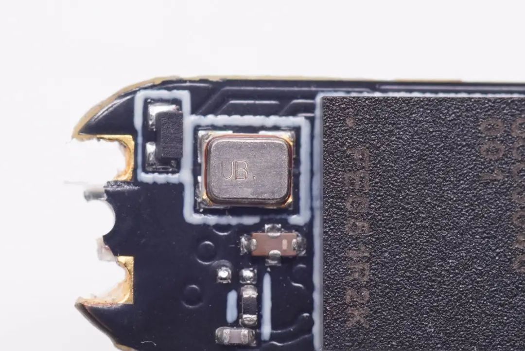 镭雕UB的晶振特写,为蓝牙芯片给予时钟。