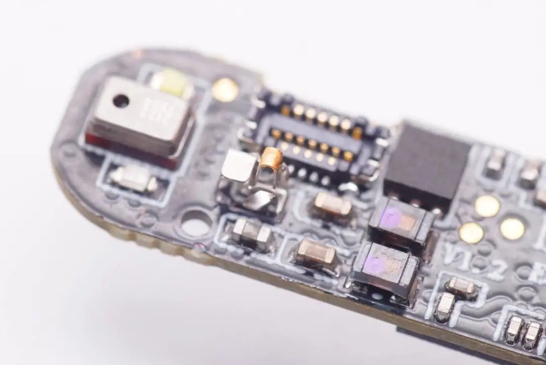 耳机头内FPC排线背面电路一览,导线焊点透明胶水加固防护。末端采用BTB连接器连接到主板。