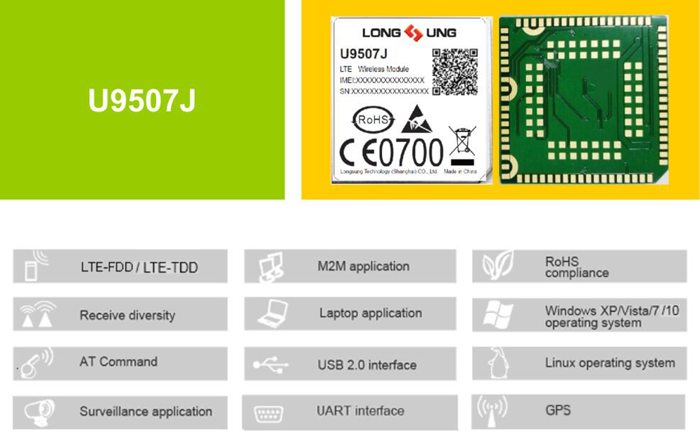 U9507J is a wireless module which is designed for the global market. It is a consumptive product; It can be designed in many kinds of applications which can work on LTE-FDD/LTE-TDD/UMTS/GSM/GPS/ GLONASS (Optional) network.
