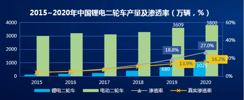 高工产研锂电研究所(GGII)数据显示,2020年中国电动二轮车用锂电池出货量达9.7GWh,同比增长78%。电动两轮车行业的锂电池渗透率近27%,其中民用电动车实际锂电池渗透率仅约16.2%。